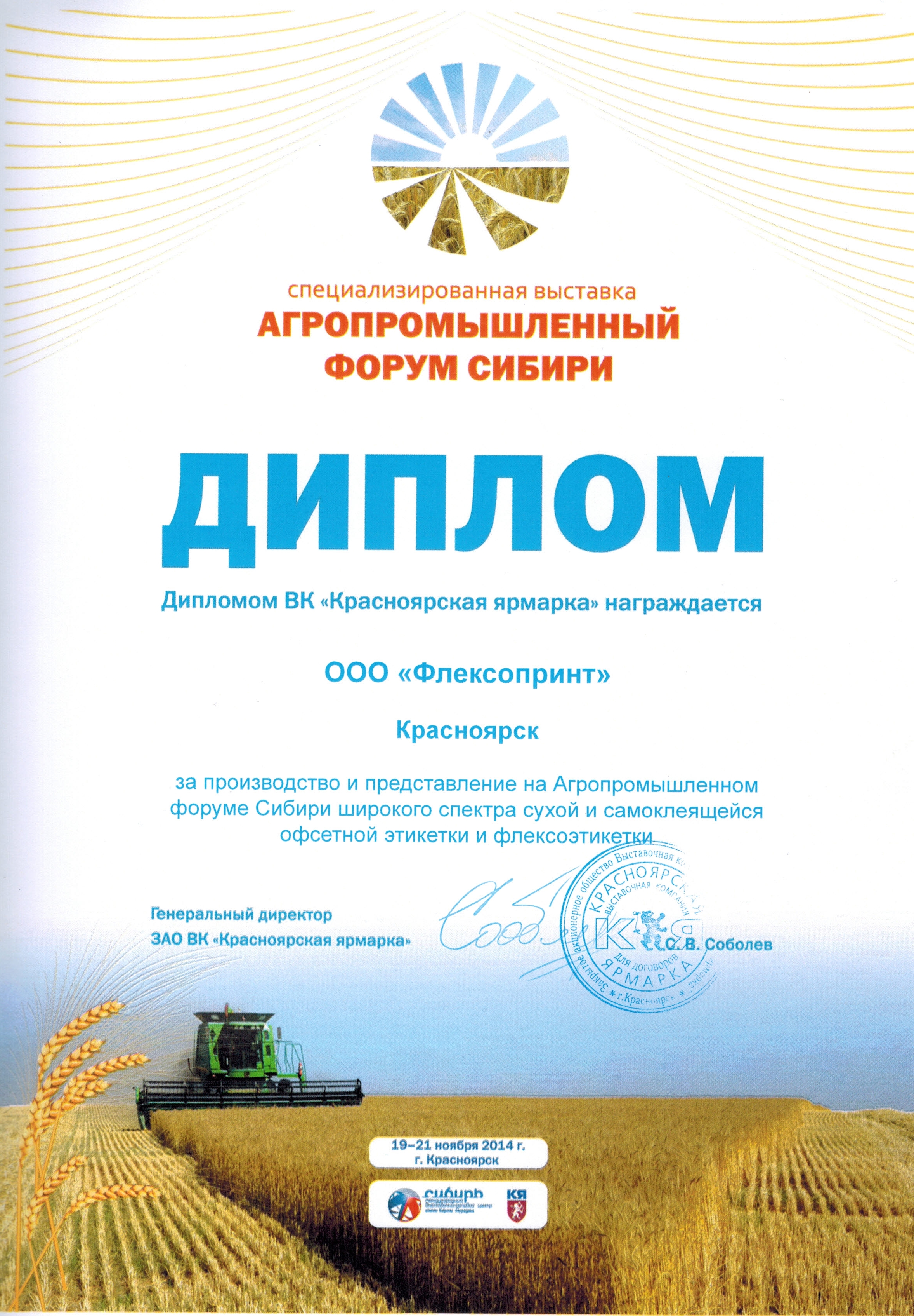 2014. Диплом за участие в "Агропромышленном форуме сибири"