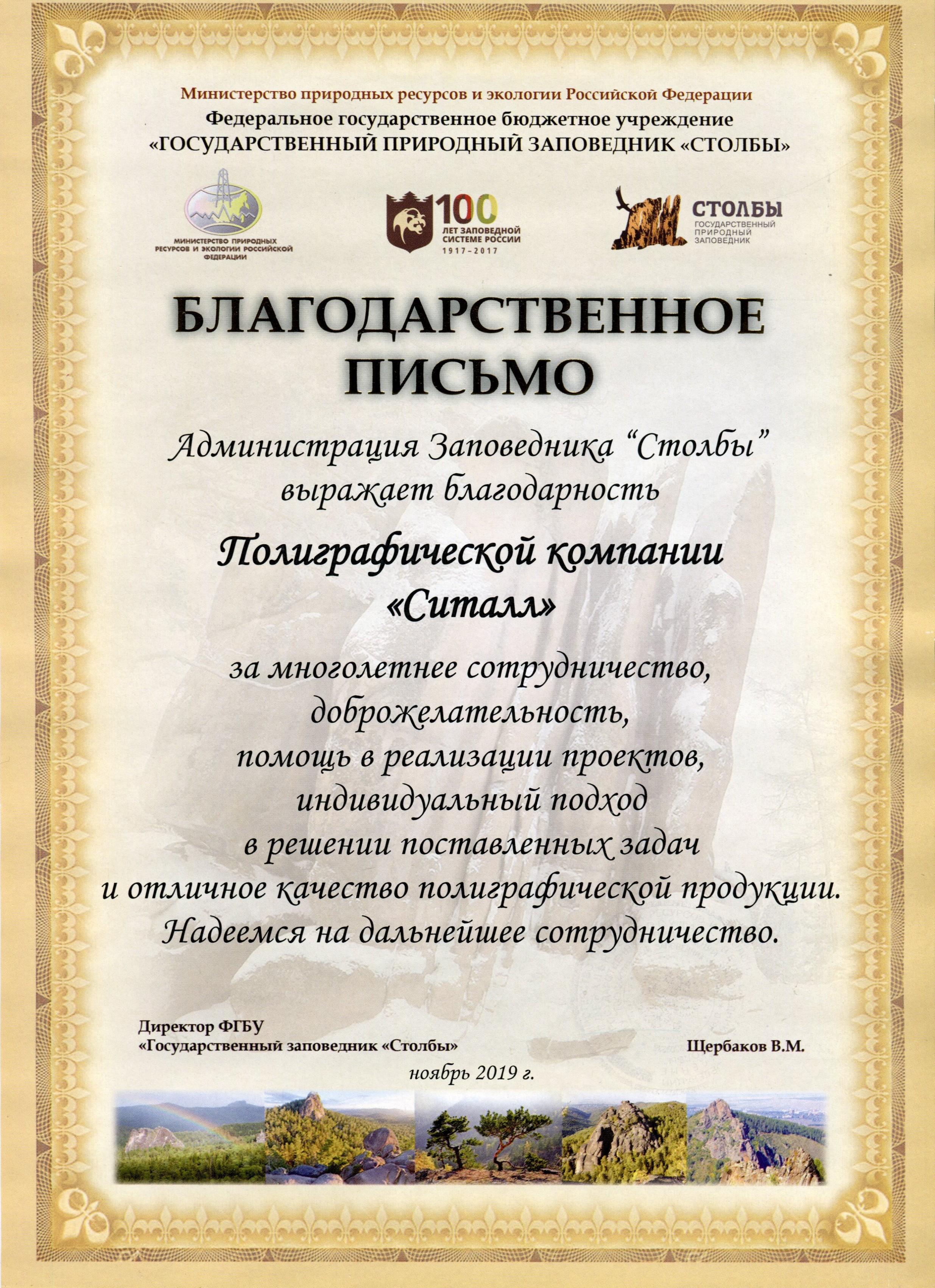 2019. Благодарственное письмо от Администрации заповедника "Столбы"